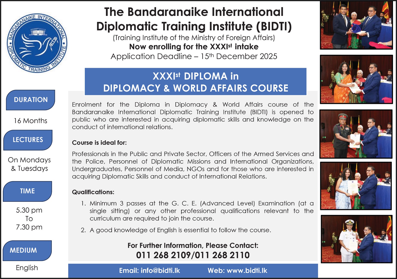 One-day training programme for newly appointed Judicial Officers organized by the Bandaranaike International Diplomatic Training Institute (BIDTI) held on 4th August 2025. Forty-nine new judges and the Judge of the High Court / Deputy Director of the Sri Lanka Judges Institute Justice Lakmal Wickramasooriya attended the programme. The programme included introduction to Diplomacy, … Read more